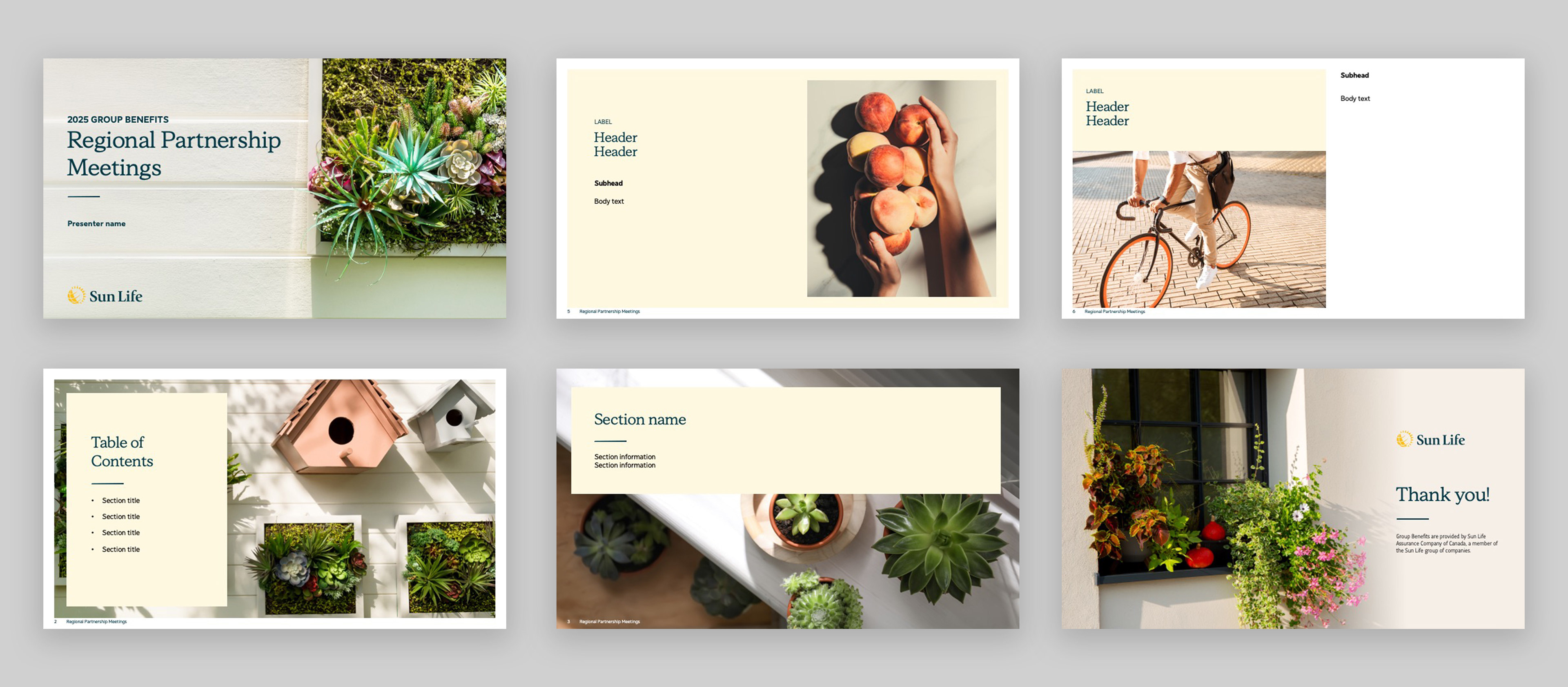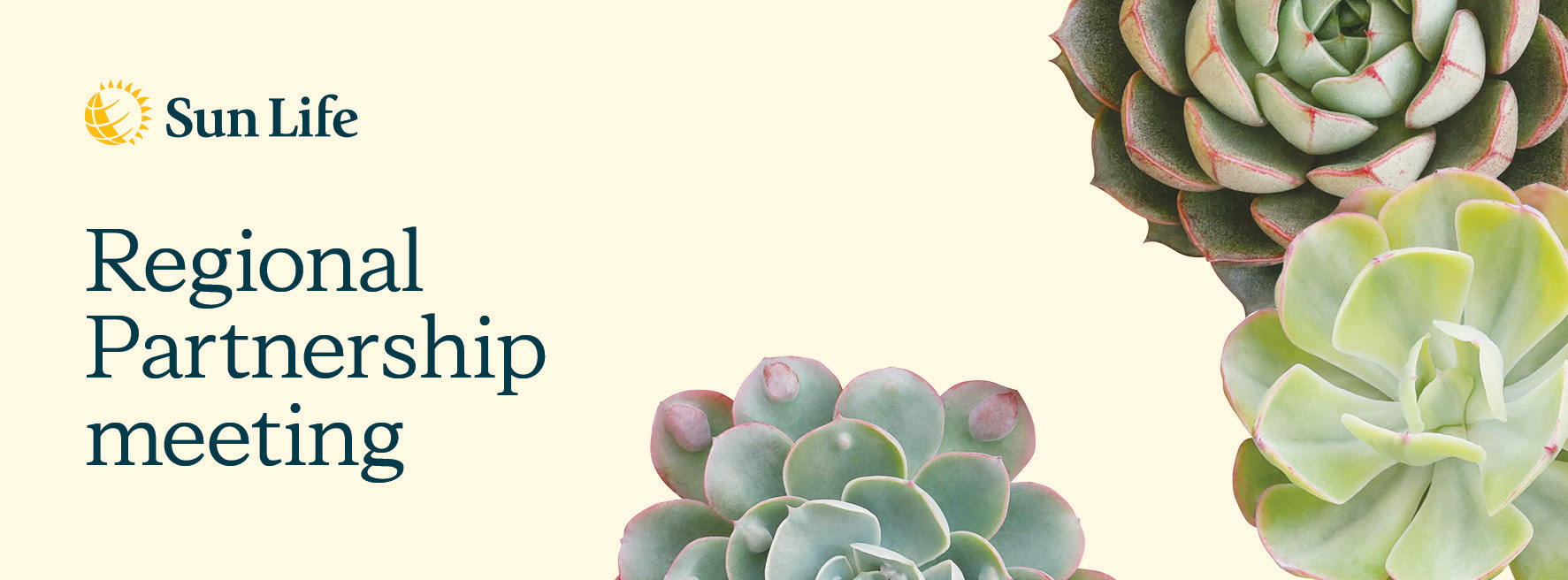 The Regional Partnership Meeting is a road show series run by Sun Life to educate and update financial advisors on the company's latest offerings. As an internal event running across multiple locations in the spring, the design needed to feel fresh, engaging, and on-brand — a departure from the typical corporate event aesthetic. Leaning into the season, I brought in floral and succulent elements with a bright, colourful palette to create an inviting atmosphere that felt energetic without losing its professionalism. I designed the full suite of event collateral — signs, banners, name tags, tent cards, and PowerPoint templates — all within Sun Life's brand standards.